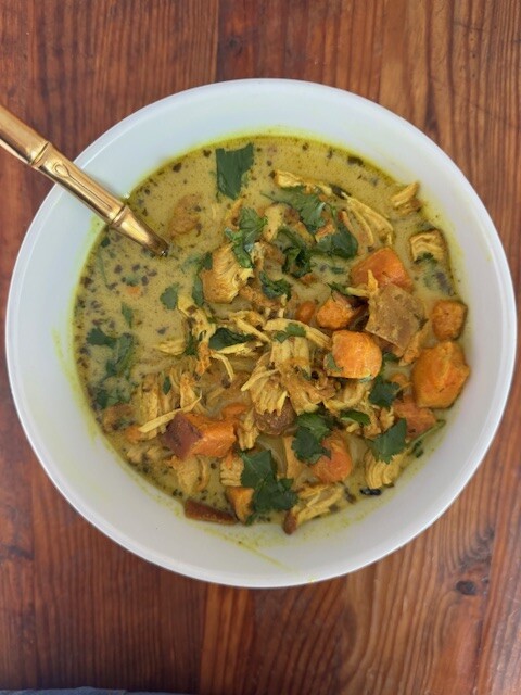 Organic Chicken braised in Coconut Milk and Turmeric with Sweet Potatoes and Quinoa on the side. A healthy and flavorful stew.