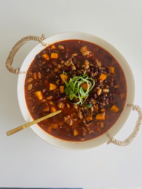 Organic Ground Turkey, Sweet Potatoes and Beans combine for a flavorful, different take on traditional Chili.